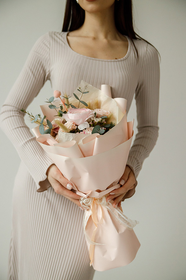 В букете гармонично сочетаются нежные цветы и фактурная зелень, создавая воздушный, утончённый образ: