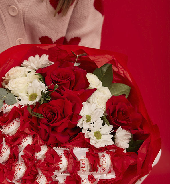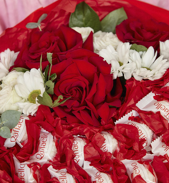 Яркий и эффектный букет, который сочетает в себе красоту живых цветов и сладкий сюрприз. Насыщенные алые розы создают выразительный центр композиции, символизируя любовь и внимание. Нежные кустовые хризантемы и кустовые розы добавляют легкость, объем и воздушность, делая букет более мягким и гармоничным. Особым акцентом становятся изысканные конфеты Raffaello, аккуратно вплетенные в композицию и превращающие букет в оригинальный и запоминающийся подарок.