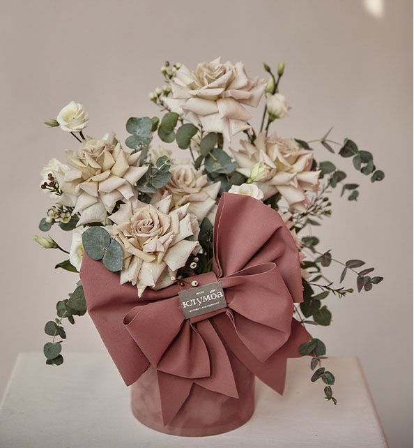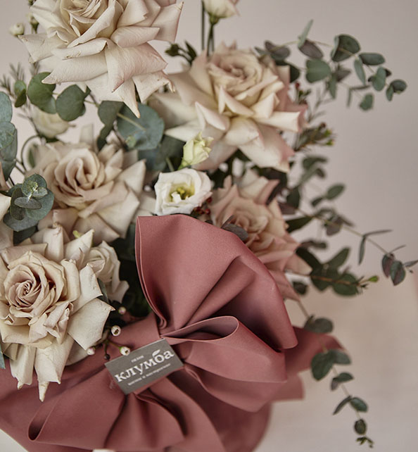 Нежная цветочная композиция в утончённой цветовой гамме, наполненная теплом и элегантностью. Кремовые и пудровые розы создают роскошную основу букета, а воздушная эустома добавляет ему лёгкости и романтичности. Веточки эвкалипта придают композиции природный шарм и изысканную фактуру. Стильная шляпная коробка с декоративным бантом подчёркивает особую эстетику подарка, делая его идеальным для выражения самых искренних чувств.
